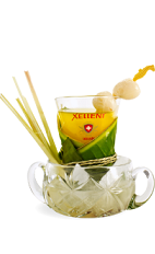 The Xellent Thai is a tropical drink recipe made from Xellent vodka, orange juice, lemon juice, chili syrup, lemongrass and lychee fruit, and served over ice in a rocks glass.