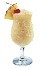 The Tiki Treat is a blended drink served in a hurricane glass, made from mango, coconut, coconut cream, aged rum and lemon juice.