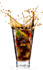 The Coco Cooler drink is made from Malibu coconut rum, Coca-Cola, bitters and lime, and served over ice in a highball glass.